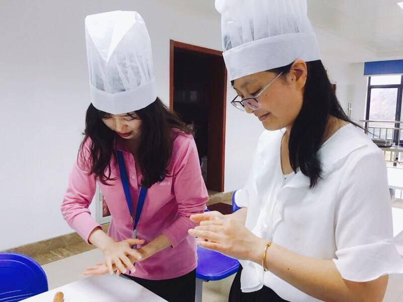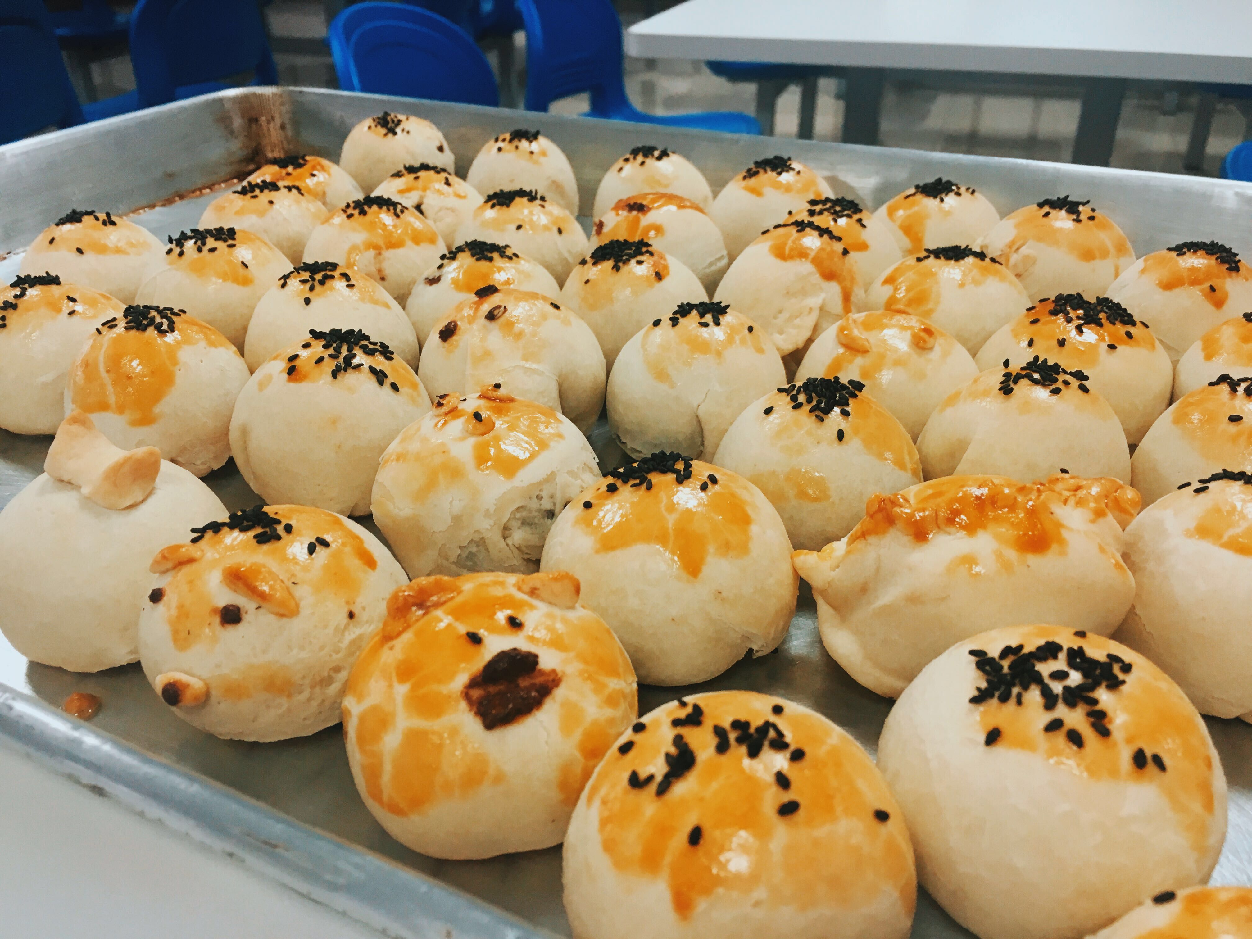 為了做好這關(guān)鍵的“酥皮”,面點(diǎn)師傅貼心地為大家準(zhǔn)備好了油酥面團(tuán)。但如何讓這外皮層層起酥,面團(tuán)的折疊、松弛和均勻搟壓可是重點(diǎn)。“老師,是這么折疊嗎?”、“老師,我這搟得對(duì)不對(duì)?”食堂里不時(shí)傳來大家虛心好學(xué)的詢問聲。包餡、搓圓和涂抹蛋液……沒多久,送進(jìn)了烤箱的月餅就散發(fā)出了誘人的香味。