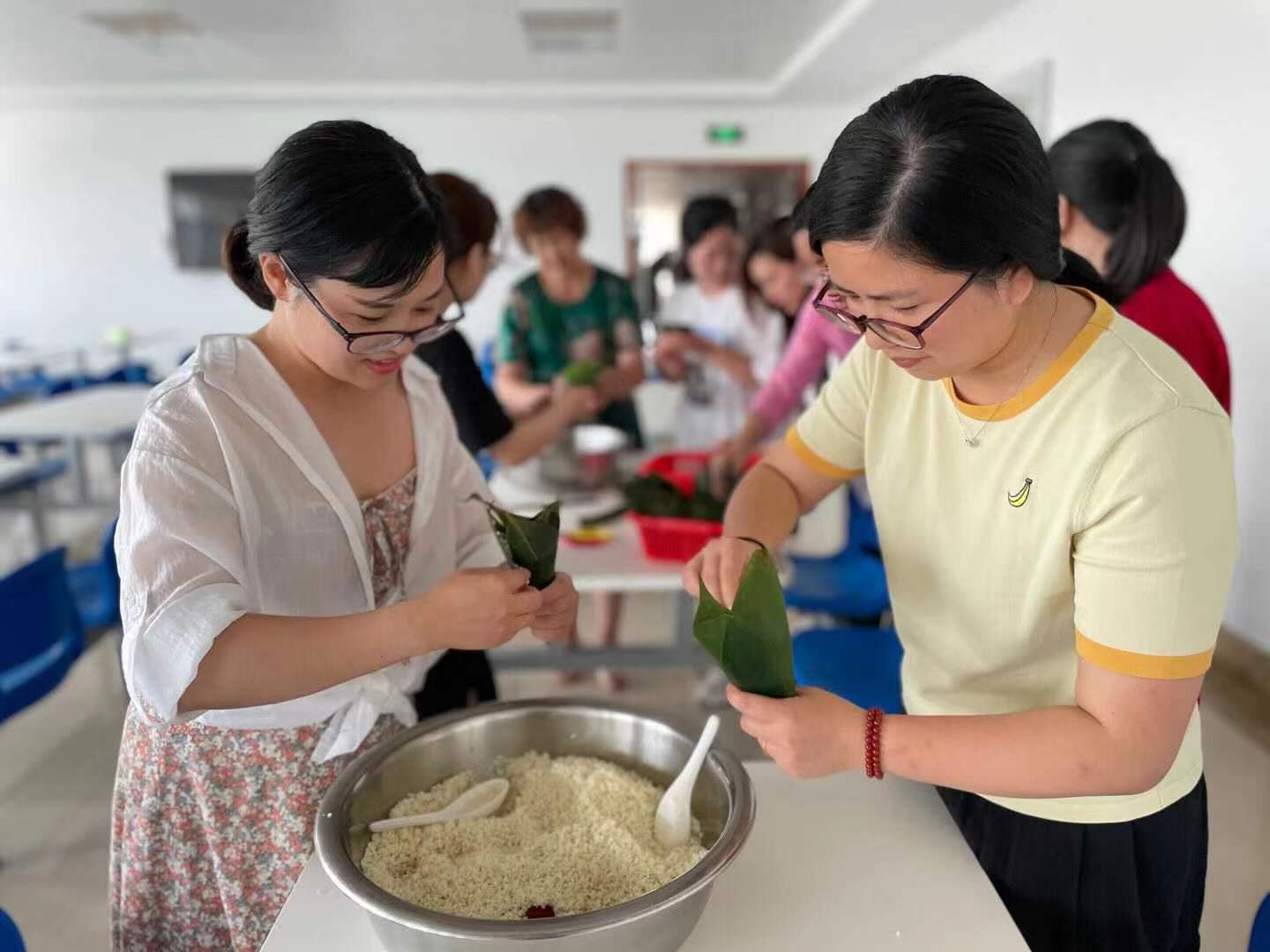 取粽葉、捏棱角、填餡料、裹粽子……活動(dòng)現(xiàn)場(chǎng)其樂融融,不時(shí)傳來歡聲笑語。在包粽子的過程中,大家互相交流,互相學(xué)習(xí),“疊粽葉是關(guān)鍵,捏棱角要巧勁,放餡料不貪多,綁?mèng)绽K要扎緊”,經(jīng)過經(jīng)驗(yàn)傳授,包出來的粽子逐漸變得“像樣”起來。掌握了訣竅的粽子,既不漏米,還能好看又飽滿。不一會(huì)兒一個(gè)個(gè)帶著清香的小粽子就擺滿了桌子。