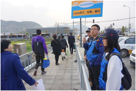 清明小長假期間,我公司每天都有三名“千人交通志愿團”的志愿者在軌道寶幢站志愿服務(wù)。五點四十八分,隨著首班軌道列車緩緩駛?cè)雽毚闭?,早已準備就緒的工作人員以及一群群身著馬甲的志愿者們便開始了他們一天忙碌的工作。