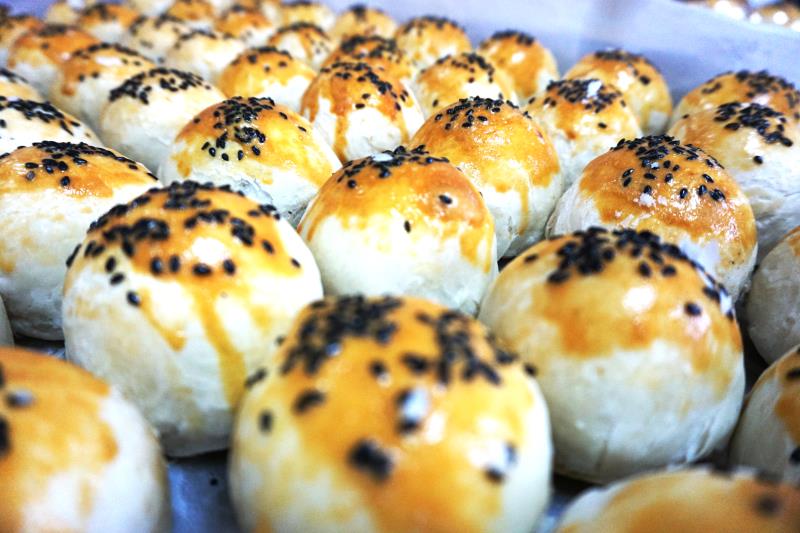 大家在面點(diǎn)師傅的指導(dǎo)下紛紛“大顯身手”,揉面、搟皮、包圓,不在話下。不一會(huì)兒功夫,“檢測(cè)牌”手工蘇月都已整整齊齊碼在盤里。平日里,抹砂漿的能工巧匠這回成了抹蛋液的能手,給月餅上妝添彩。